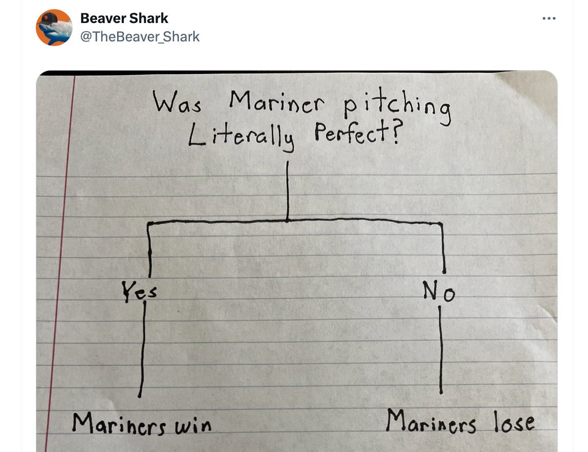 In other words: If the Mariners didn’t get extraordinary effort from their starting pitcher over the first two weeks of the season, they weren’t winning. A more elegant explanation of this trend was expressed in a flow chart passed along by TheBeaver_Shark on the platform formerly known as Twitter.